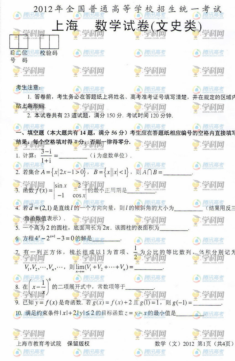2012年上海高考文科數(shù)學(xué)真題及答案公布