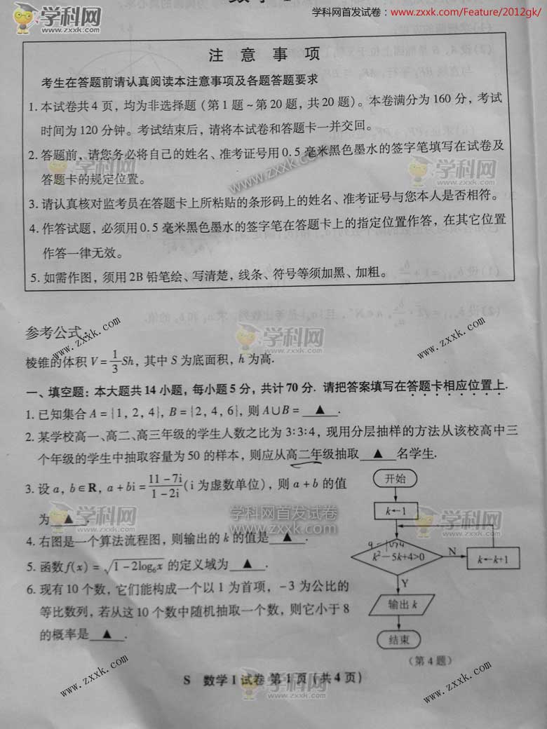 2012年江蘇高考數(shù)學(xué)真題及答案公布