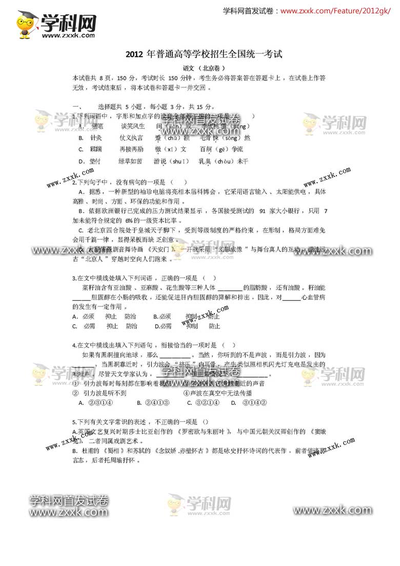 2012年北京高考語文真題及答案公布