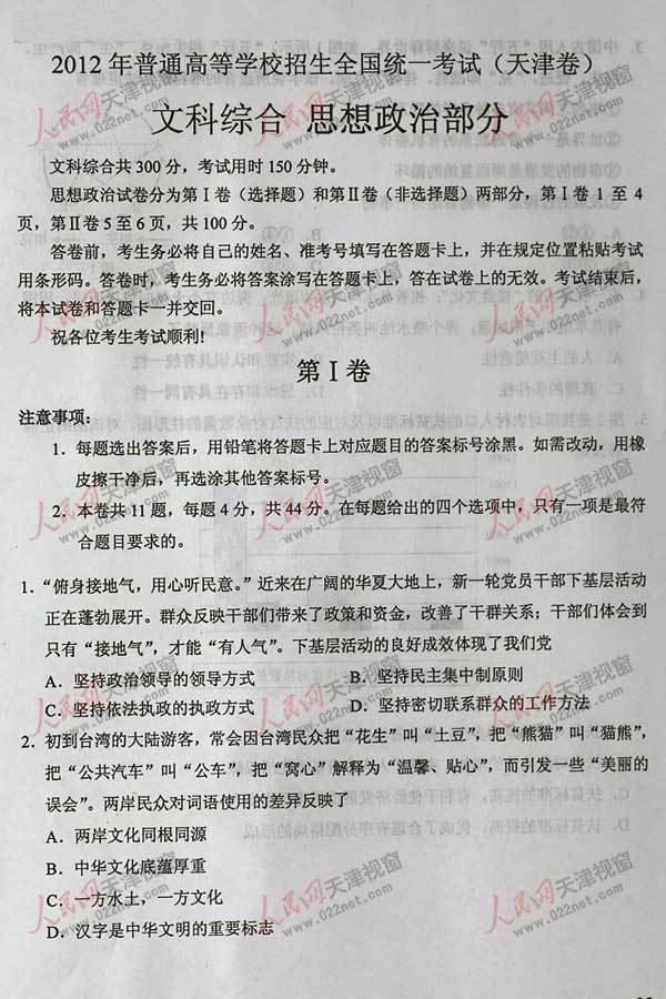 2012年高考天津卷文綜真題及答案公布