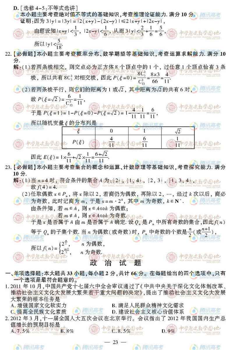 2012年江蘇高考政治真題及答案公布