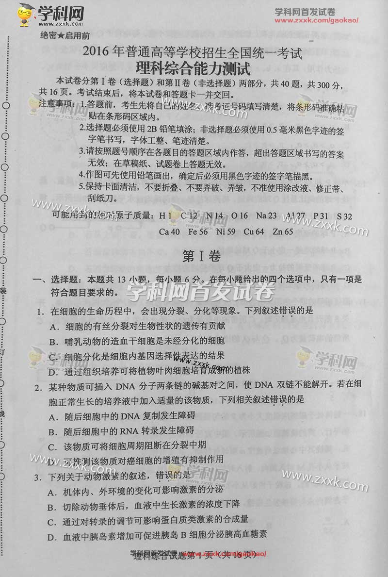 2016年寧夏高考理綜真題及答案