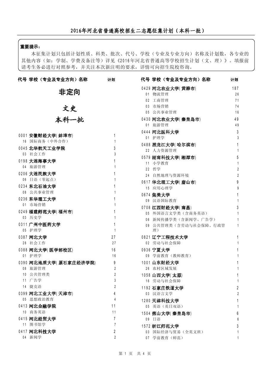 2016年河北高考本科一批、地方專項(xiàng)計(jì)劃二志愿征集計(jì)劃