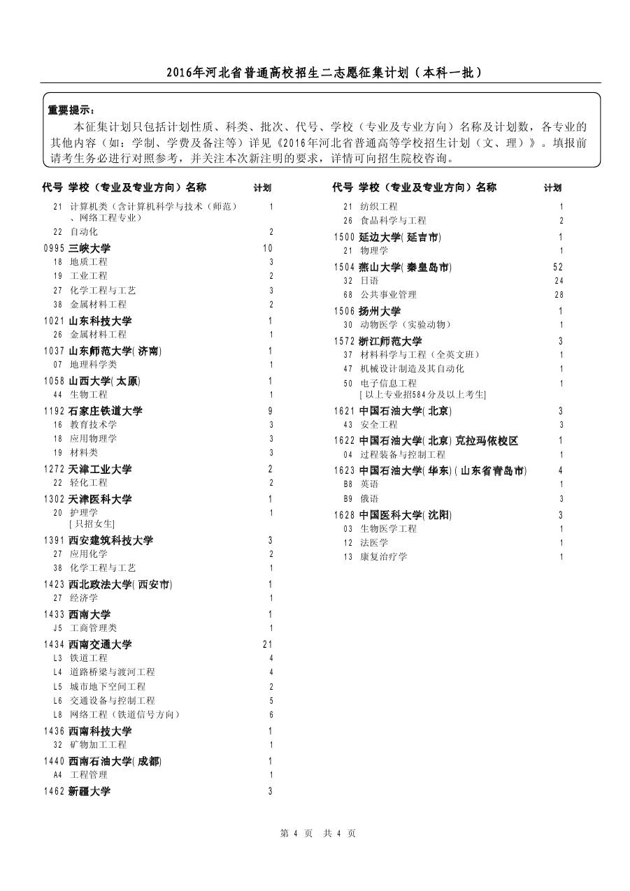 2016年河北高考本科一批、地方專項計劃二志愿征集計劃(4)