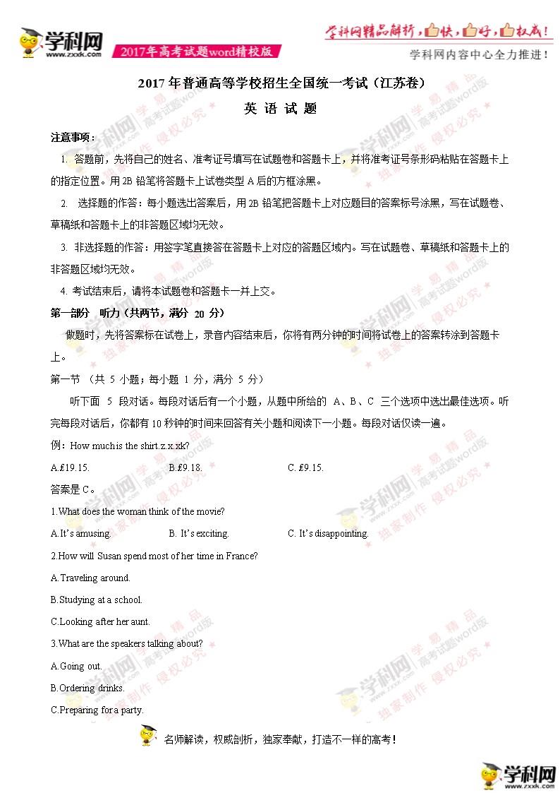 2017年江蘇高考英語真題及答案由育路高考網考后首發,更多關于江蘇高考答案、江蘇高考試題等信息,請關注育路高考網或微信搜索“育路高考招生網”獲取。