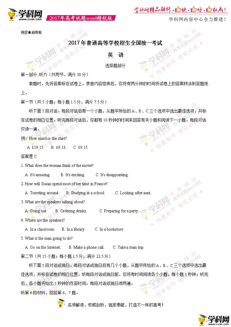 2017年浙江高考英語真題及答案由育路高考網(wǎng)考后首發(fā),更多關(guān)于浙江高考答案、浙江高考試題等信息,請關(guān)注育路高考網(wǎng)或微信搜索“育路高考招生網(wǎng)”獲取。