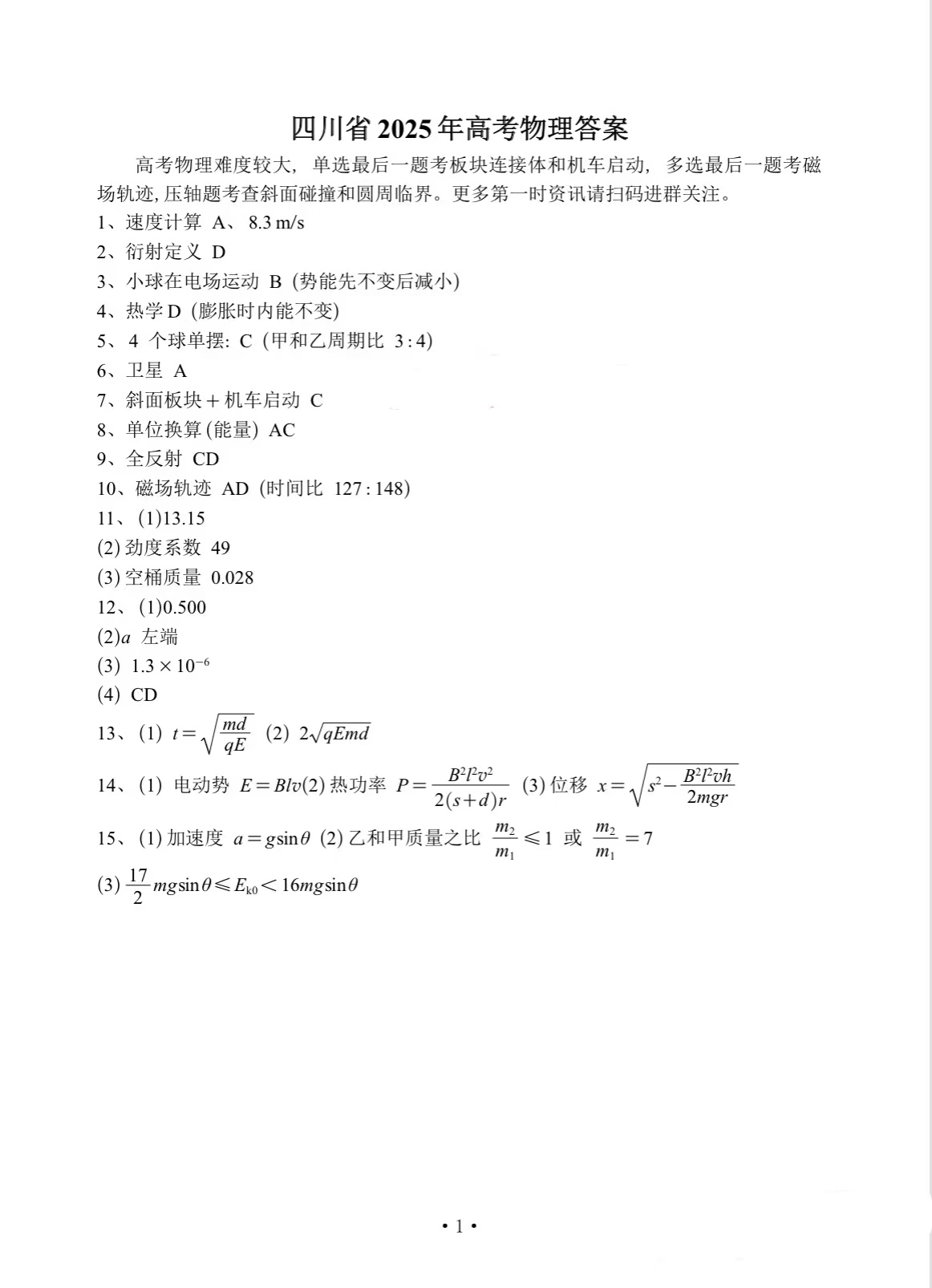 新疆、西藏地區為傳統高考模式,物理科目在理綜科目進行考試,考試時間為6月8日上午9:00-11:30。四川高考物理答案已出爐: