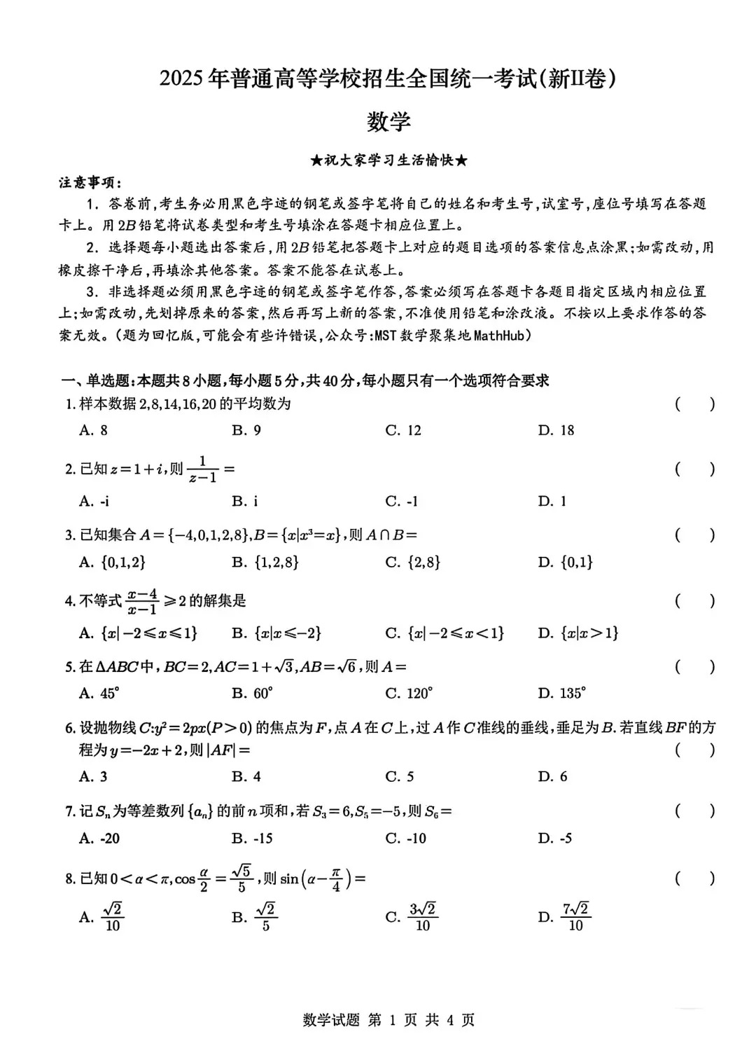 (一)新高考一卷真題及答案
