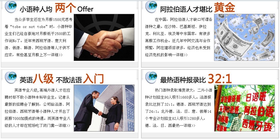 隨著外語學習需求多元化,“后世博時代”市場對小語種人才的需求也會保持長期增長。大量的小語種人才將充實到新聞傳媒機構、外企和中外合資企業、各省市外辦、旅游公司、留學培訓機構等。 小語種培訓正在成為外語培訓市場上的新熱點,外語培訓市場上的“英語霸權”將被徹底終結……