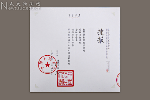 2014年,中國人民大學(xué)錄取通知書采用全新設(shè)計,從學(xué)生視角出發(fā),緊扣“國民表率、社會棟梁”的人才培養(yǎng)目標(biāo)和“人民、人本、人文”的辦學(xué)理念。