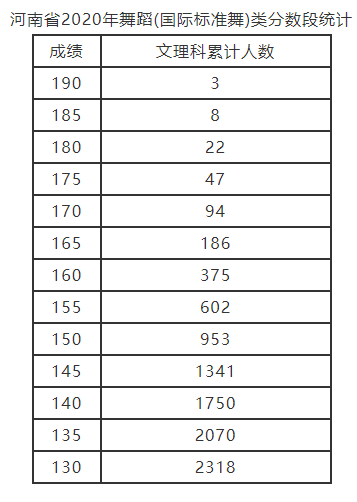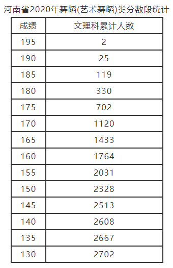 河南省2020年表演類分數段統計: