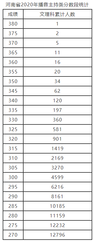 2020年河南省藝術類分數段統計表,統計表中所包含專業有:播音主持,表演、音樂、舞蹈含藝術舞蹈、國際標準舞,各專業具體分數段如下: