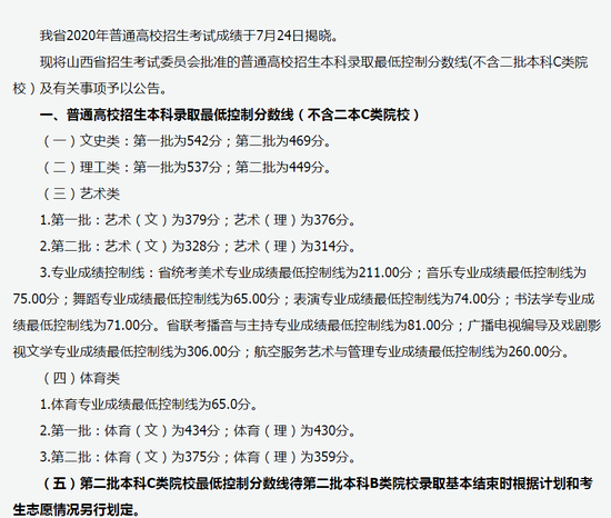 山西省7月24日公布了2020年高考分數線,重點本科文科542分,理科537分,具體情況如下: