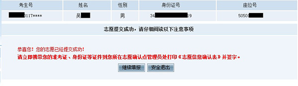 信息提交成功后將看到下面的頁面,如果下面的頁面沒有出現,可能您的志愿沒有填報成功,請到志愿填報點老師處咨詢。