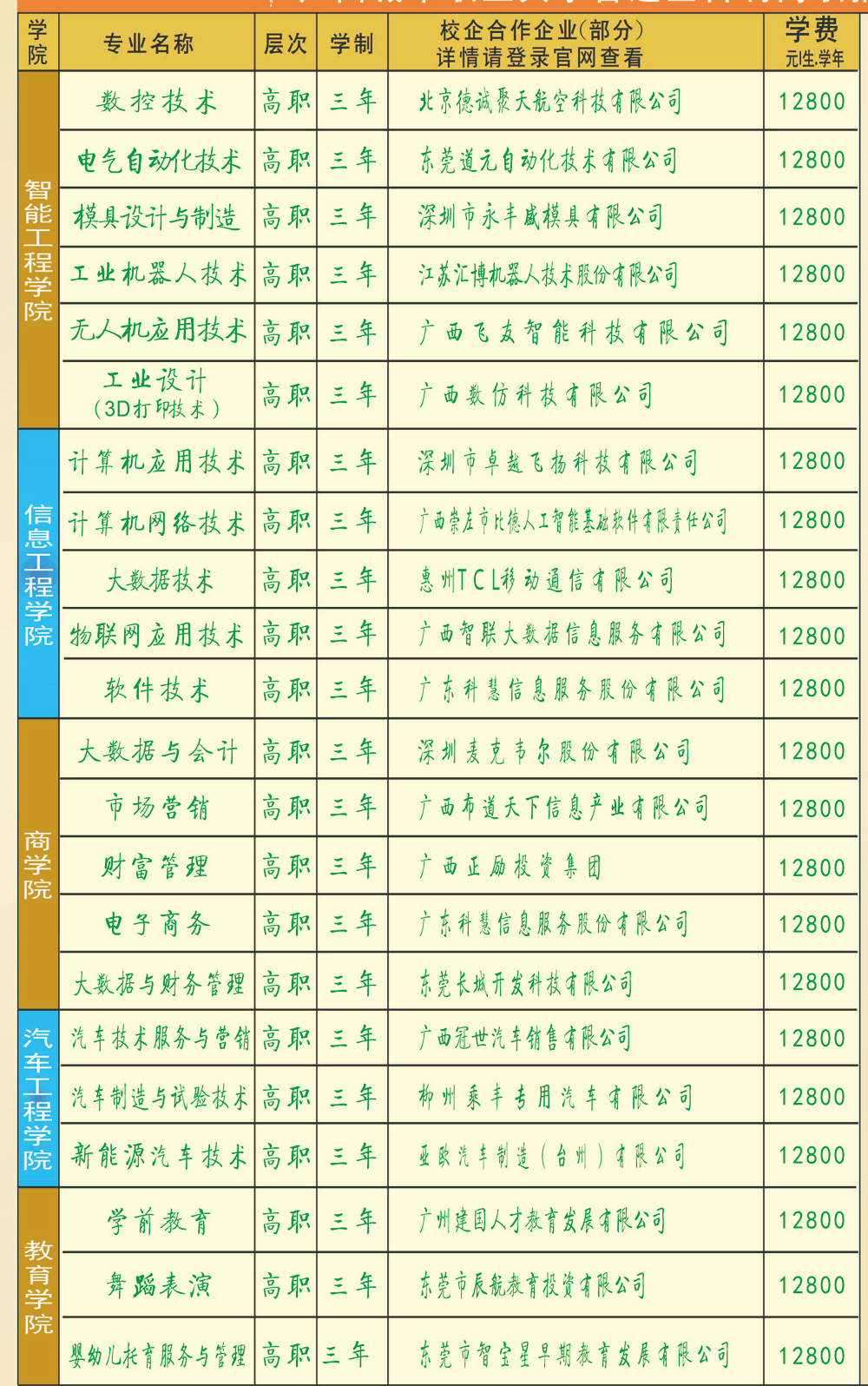 廣西城市職業大學有專科專業,例如數控技術、電氣自動化技術、模具設計與制造、工業機器人技術、無人機應用技術、工業設計(3D打印技術)、計算機應用技術、計算機網絡技術、大數據技術、物聯網應用技術等專業。以下是高校招生網搜集的具體名單一覽表,希望對大家有所幫助。