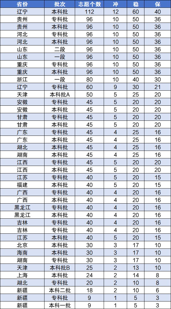 不同地區可以填報的志愿數量不同,下面是全國新高考地區高考志愿個數匯總表,以及沖穩保比例安排,可以參考。另外文中并為包含山西、內蒙古、河南、四川、云南、陜西、青海、寧夏這八個地區。因為這八個省份比較特殊,2025年首次實行新高考,志愿個數相較2024年變化較大,具體并不確定,因此未整理。
