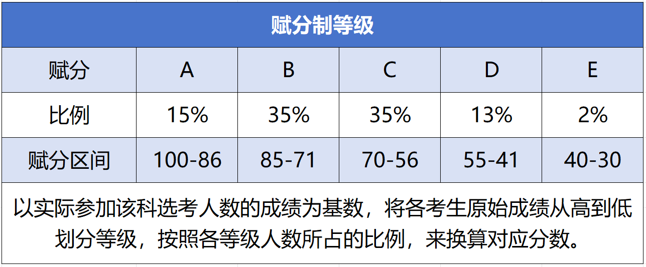 具體而言,根據(jù)考生的原始成績,將其劃分成不同的等級(如A、B、C、D、E),每個等級對應(yīng)一個分?jǐn)?shù)區(qū)間。然后,根據(jù)每個等級內(nèi)考生的數(shù)量和成績分布情況,進(jìn)行等比例轉(zhuǎn)換,最終得出每個考生的賦分成績。