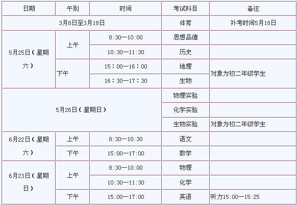 語(yǔ)文、數(shù)學(xué)、英語(yǔ)(含聽(tīng)力)、物理、化學(xué)、思想品德、歷史、地理、生物、體育、物理實(shí)驗(yàn)、化學(xué)實(shí)驗(yàn)、生物實(shí)驗(yàn)。