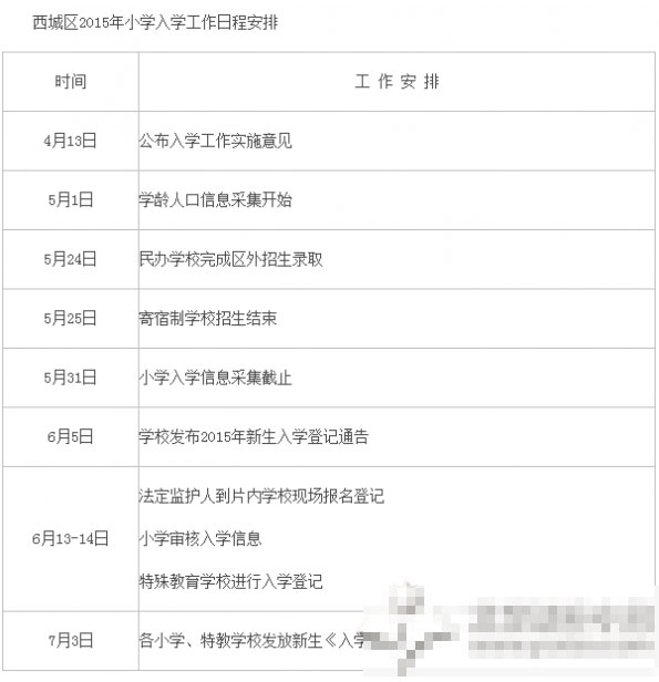 西城區(qū)2015年義務(wù)教育階段入學(xué)工作時(shí)間表