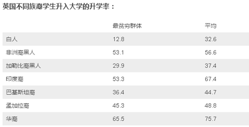 調查還顯示,非洲裔黑人和加勒比裔黑人的升學率也都高于白人的升學率。
