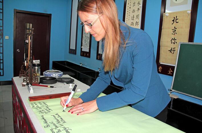 近期力邁中美國(guó)際學(xué)校舉辦了一場(chǎng)隆重的美國(guó)大學(xué)招生官見面會(huì),邀請(qǐng)了與力邁中美國(guó)際學(xué)校合作的十所美國(guó)大學(xué)(如美國(guó)塔夫茨大學(xué)等)的招生官及招生主任來(lái)到力邁中美,代表們?cè)诂F(xiàn)場(chǎng)與學(xué)生及家長(zhǎng)們面對(duì)面,就美國(guó)大學(xué)的招生和錄取等問題進(jìn)行深入的交流和互動(dòng),并且還來(lái)到校園內(nèi)的力邁書畫苑,感受文房四寶的墨香,品味中國(guó)文化的魅力。在這里,他們不僅是名校的招生官,還是被書法之魂所深深吸引的外國(guó)友人。