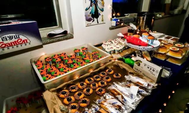未見其人,先聞其聲。在南瓜燈的點(diǎn)點(diǎn)燭光中,撒滿彩色巧克力的甜甜圈、糯米南瓜飯、有條有理的壽司,血袋飲料,關(guān)東煮 、牛排等等美食早已在攤位上擺放好,“逛吃逛吃”街上也已是摩肩接踵,被前來的學(xué)生擠得滿滿,老遠(yuǎn)就能耳聞那一鍋粥似的熱鬧。