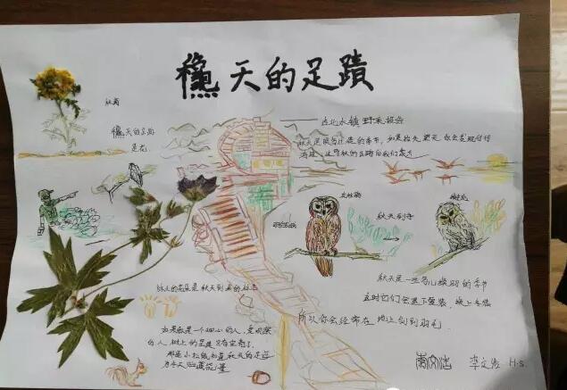孩子們用絨線棒拼寫著對秋天的喜愛;用樹葉制作明信片、貼畫,編寫故事;賞析、朗讀秋天的詩文;用文字記錄秋天的意境;用鏡頭定格秋天的顏色。