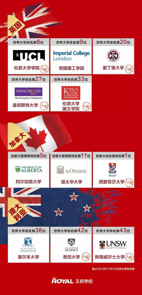 加拿大、澳大利亞方向同樣成績顯著,墨爾本大學、悉尼大學、阿爾伯塔大學、西蒙菲莎大學紛紛向王府學子拋來橄欖枝。