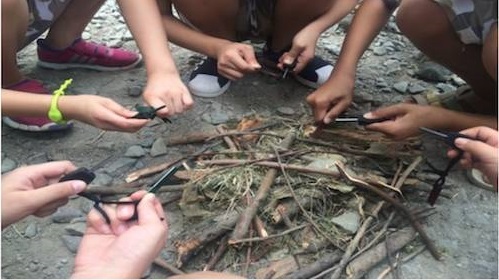 孩子們將收集來的枯木堆在一起,用最原始的方式,學會生火。