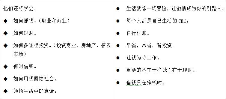 * 孩子們接受的是基礎(chǔ)的、長久受用的個(gè)人財(cái)富管理技巧和30種“財(cái)富創(chuàng)造準(zhǔn)則”。這兩種方式穿插其中,妙趣橫生,難以忘懷。