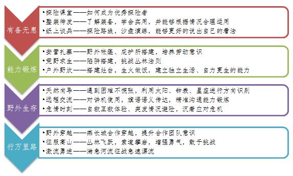 訓練目標:叢林生存技能、冒險心智測試、學會自制地圖、了解野外裝備