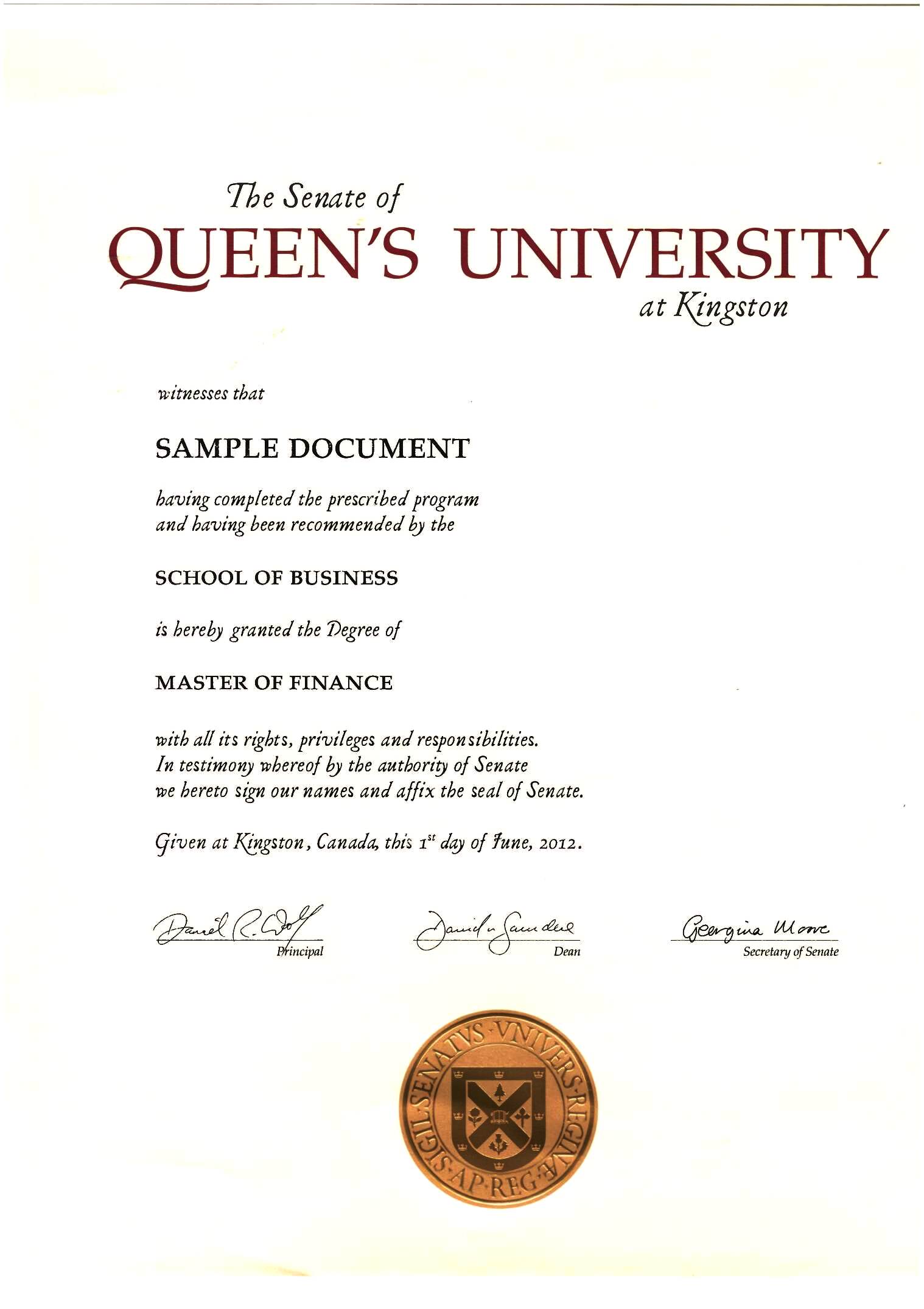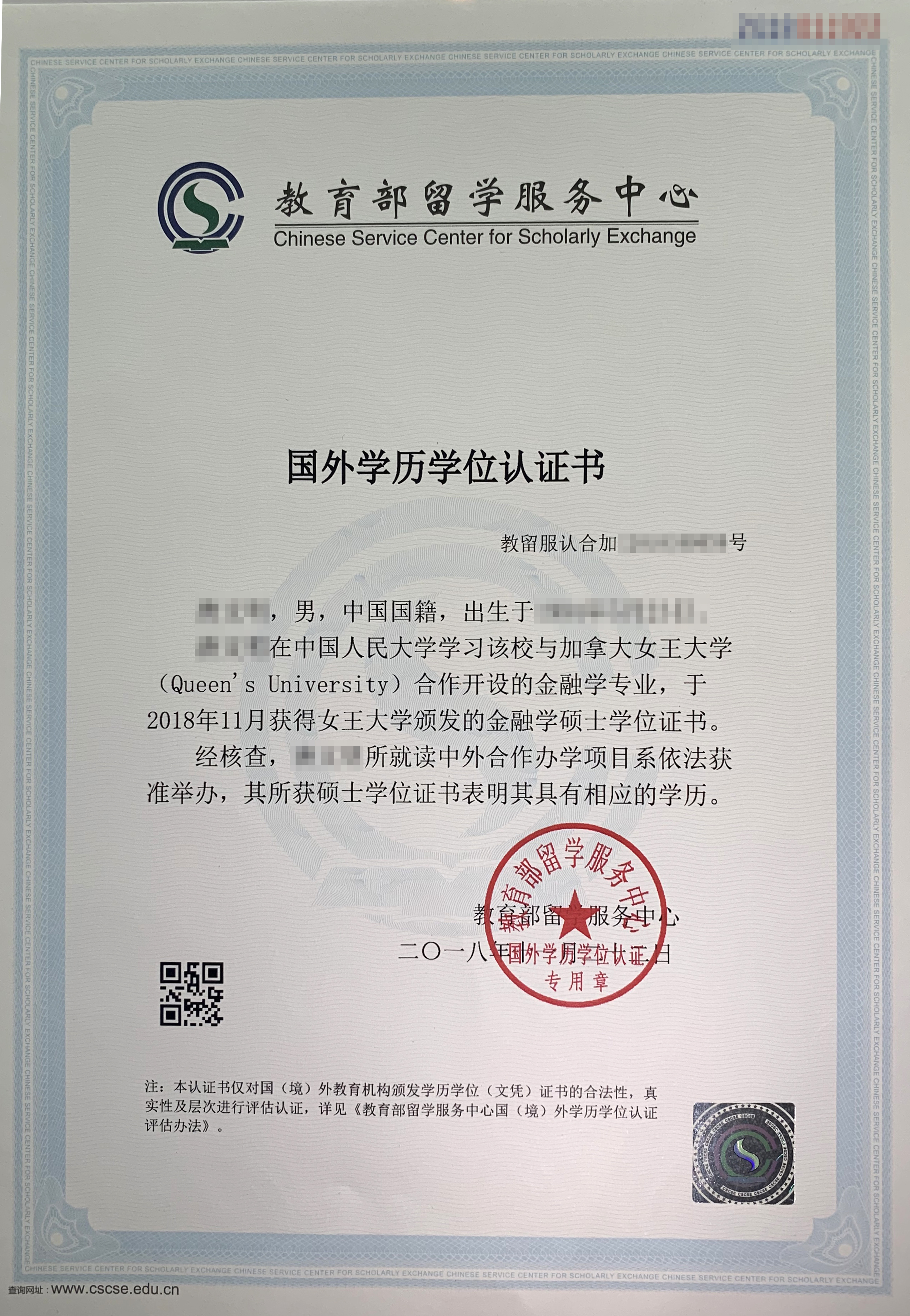 報考中國人民大學與加拿大女王大學金融管理碩士的同學,完成本項目十門課程,通過考核符合畢業要求的學生將獲得由女王大學頒發的金融碩士學位證書,該學位受教育部認可(批準書編號:MOE11CA1A20131441N),可做認證。