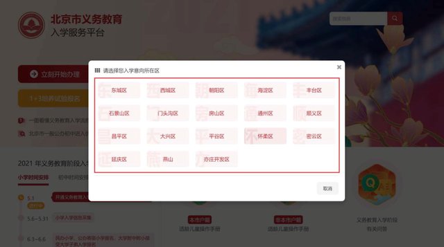 1.在瀏覽器輸入:yjrx.bjedu.cn,打開以下頁面,點擊“立刻開始辦理”按鈕后選擇需要進行注冊的區(qū),點擊進入。