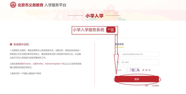 4.在打開“小學入學服務(wù)系統(tǒng)”登錄頁面后,輸入在“非本市戶籍適齡兒童接受義務(wù)教育證明證件材料審核入口”注冊時生成的賬號、密碼和圖片驗證碼,點擊“登錄”進入系統(tǒng)。