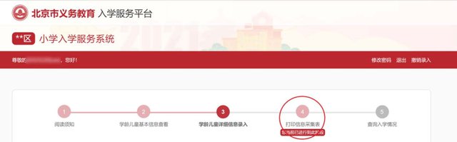 5.成功登錄小學入學服務(wù)系統(tǒng)后,確認在“非本市戶籍適齡兒童接受義務(wù)教育證明證件材料審核入口”系統(tǒng)注冊并同步到此系統(tǒng)內(nèi)的信息無誤后,用戶可點擊上方步驟導航處的“④”,打印信息采集表,系統(tǒng)將打開新的頁面顯示信息采集表。