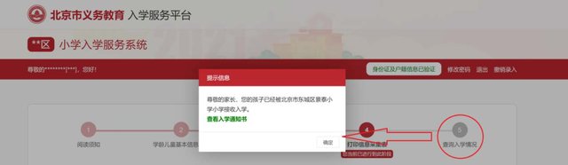 根據(jù)區(qū)安排,用戶可登錄小學入學服務(wù)系統(tǒng)點擊上方步驟導航處的“⑤查詢?nèi)雽W學校情況”,查看入學結(jié)果。