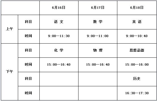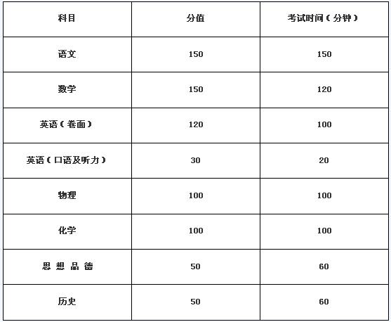 語(yǔ)文、數(shù)學(xué)、英語(yǔ)、物理、化學(xué)、思想品德、歷史為文化考試科目,在初三年級(jí)進(jìn)行。其中,語(yǔ)文、數(shù)學(xué)、英語(yǔ)、物理、化學(xué)實(shí)行閉卷考試,思想品德、歷史實(shí)行開(kāi)卷考試。各文化學(xué)科由市教育局統(tǒng)一命題、制卷,全市統(tǒng)一組織網(wǎng)上評(píng)卷。英語(yǔ)聽(tīng)力口語(yǔ)測(cè)試按省統(tǒng)一要求組織,成績(jī)計(jì)入英語(yǔ)學(xué)科總分。各科考試成績(jī)由市教育局統(tǒng)一合成,合成后由各縣(市、區(qū))發(fā)布。文化考試時(shí)間為6月16日—18日,考試結(jié)果以分?jǐn)?shù)形式呈現(xiàn),考試日程、各學(xué)科分值及考試時(shí)間見(jiàn)下表: